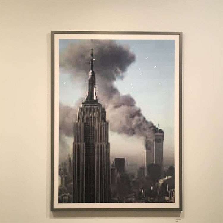 WTCに飛行機が衝突した瞬間の写真をピクセル化。写真は様々なメディアで見ることは一般的になっている中、こうして実物を目の前にして見る意味を考えさせられる作品。ピクセルのサイズは原寸作品に合わせて決められているため、スマホやPC等のメディアで見ると全く別物になってしまう。