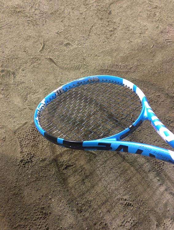 ラケットに重りをつけて調整。トップヘビーにすることで、ラケットスイングが速くなることを期待して。