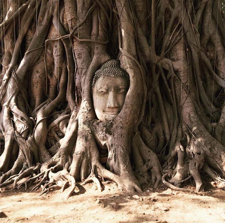 アユタヤのワット・マハタート。樹木の根っこに絡め取られた仏頭。自然の生命力、そして静かな凶暴さ、神秘性を感じる。 ビルマの侵攻により徹底的に破壊され、散乱していた仏頭に樹木が絡みついたのでしょうか。