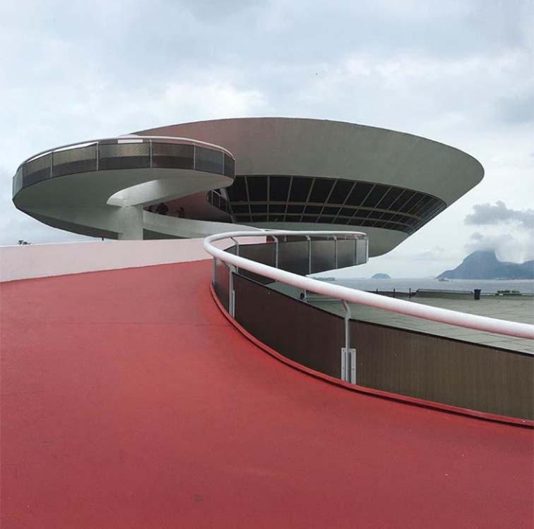 オスカー・ニーマイヤーによる美術館。まるで宇宙船が降りてきたような形。アプローチのスローブもカーブを描いており、造形的な部分ばかりが目に入ってくるが、このアプローチも周囲の景色、そしてこれから美術館に入るという高揚感を刺激してくれる。ひとがどのように感じるのかが大切に設計されていることが体験を通して理解できる。