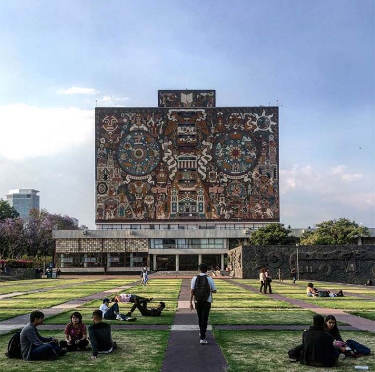 メキシコの土着的な印象を受ける壁画に覆われた大学図書館。建築自体は非常にモダニズム的にまとめられている。1階の閲覧スペースはトップライトからの柔らかい光に満たされ、過ごしやすい雰囲気。